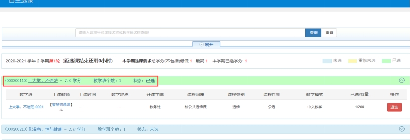 Step1:“选课”-“自主选课”,线下面授课程可设置“上课星期”和“上课节次”进行查询选课,“智慧树慕课”可设置“开课学院”为“智慧树在线教育平台”进行查询选课;点击相应课程的展开按钮,出现课程教学班上课安排,界面如下: