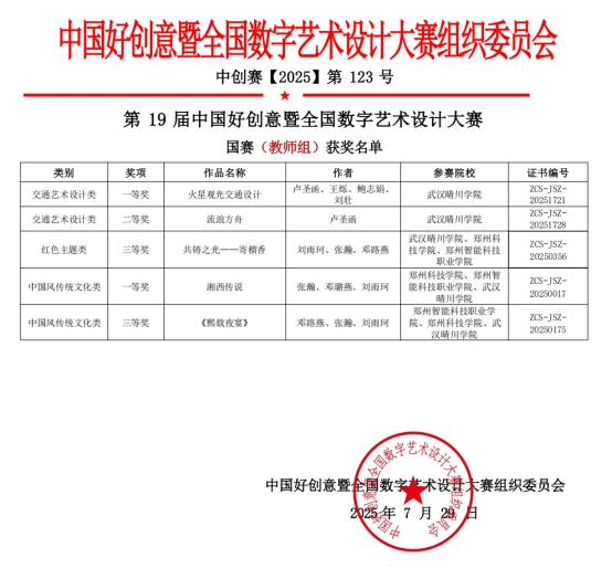 (本网讯 来源:设计工程学院 编辑:姚瑶)近日,第19届中国好创意暨全国数字艺术设计大赛评审结果揭晓。武汉晴川学院师生双线告捷、全面丰收——教师组荣获国家级奖项5项,包括一等奖2项、二等奖1项、三等奖2项;学生组斩获省级奖项9项,其中一等奖1项、二等奖2项、三等奖6项。